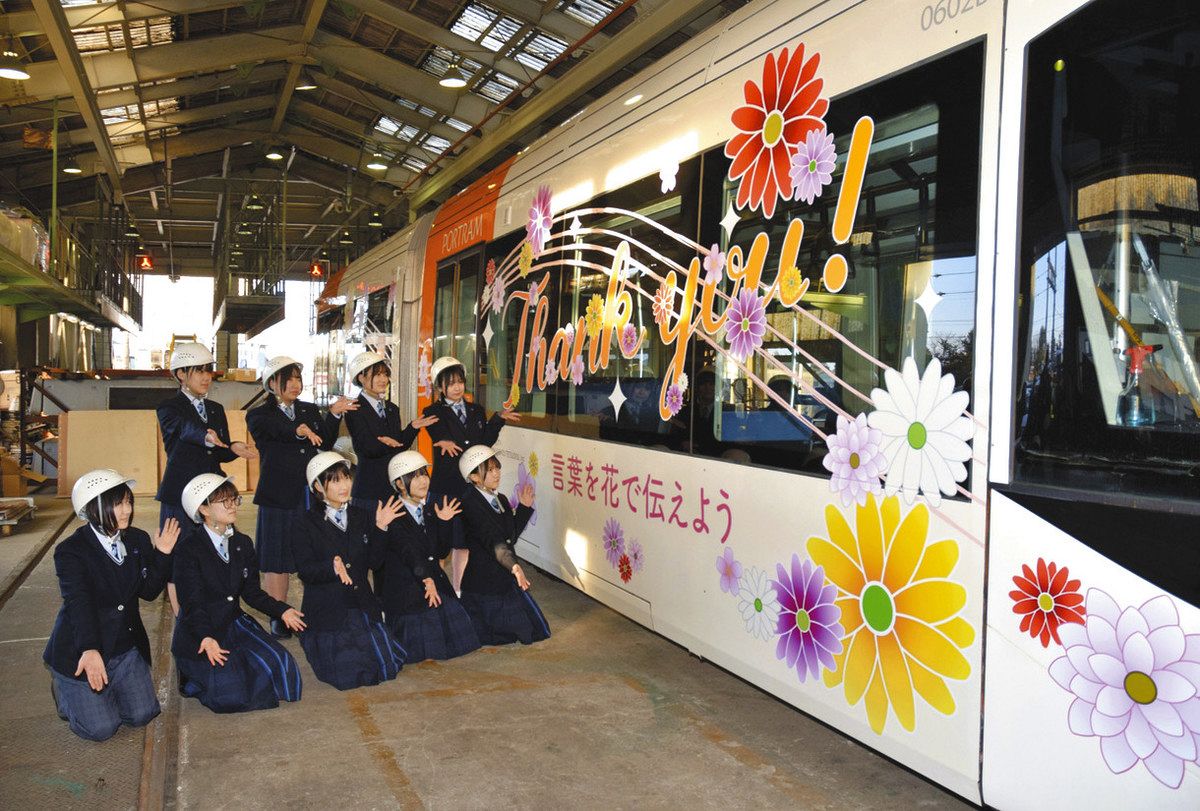 富山市/富山地方鉄道デ0602が、花贈りの日のラッピングになり、2026年2月6日(金)~3月14日(土)に運行している。